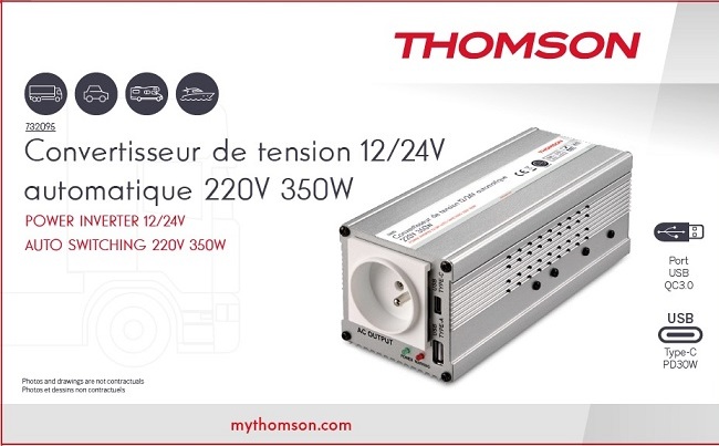 CONVERTISSEUR 12V / 24V AUTOMATIQUE VERS 220V 350W AVEC PRISE USB-A QC3.0 18W ET PRISE USB-C PD30W